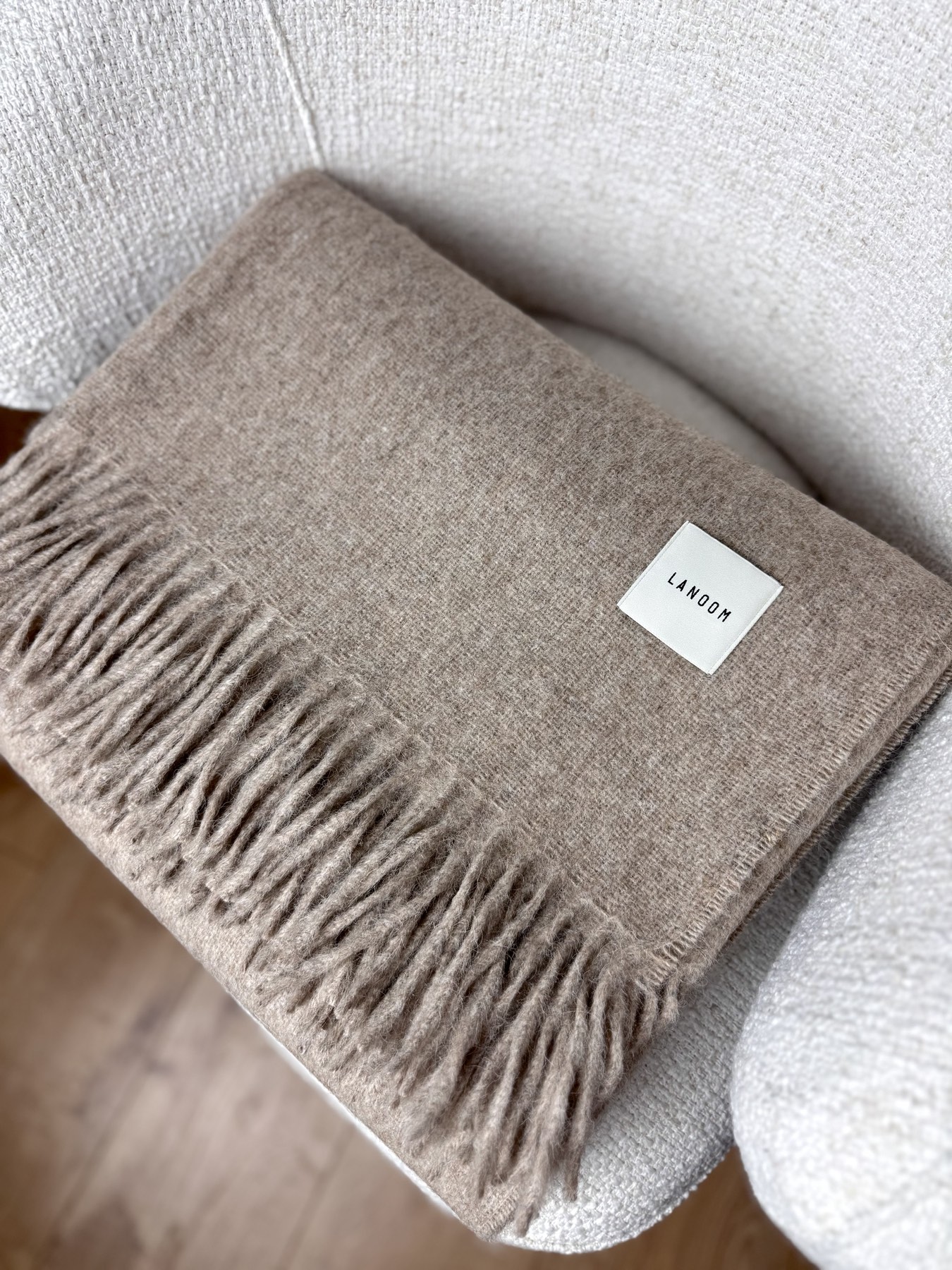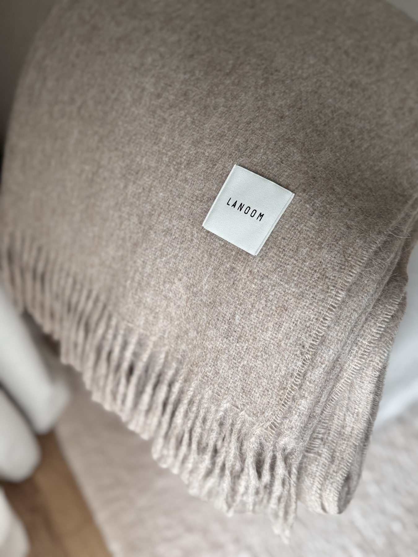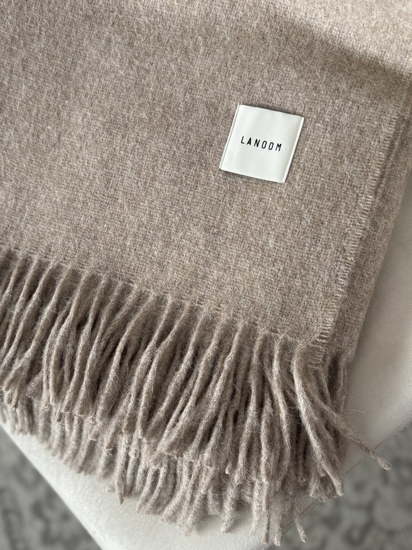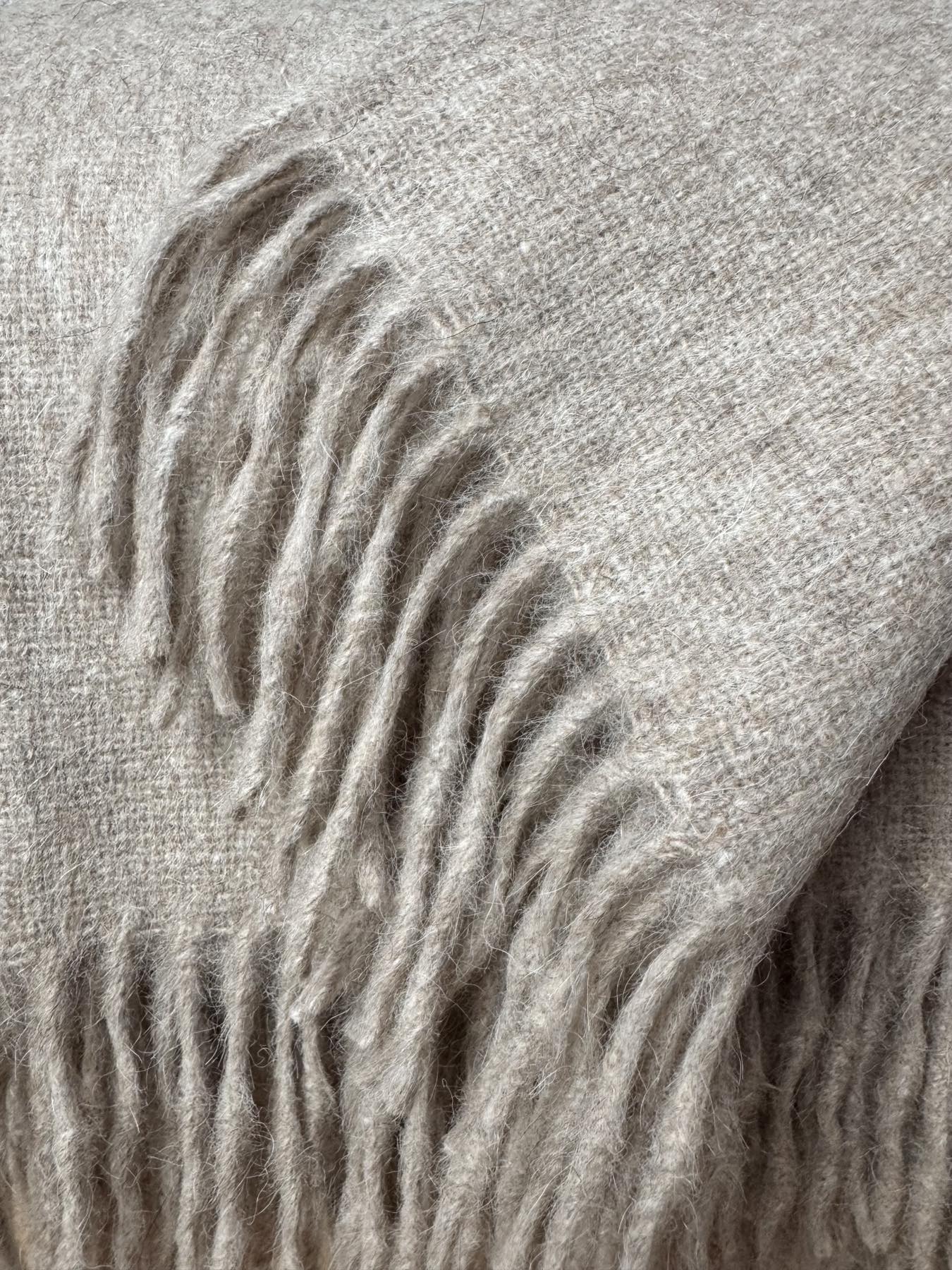 Duży i ciężki koc z alpaki i wełny w odcieniu ciemnego beżu to esencja elegancji i komfortu w naturalnym, stonowanym wydaniu.