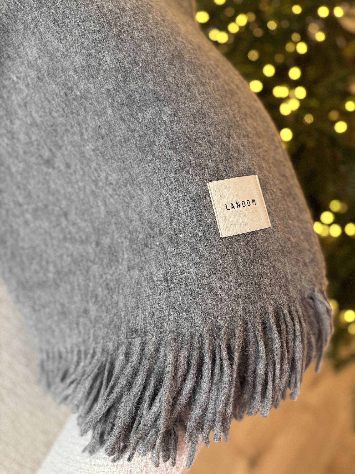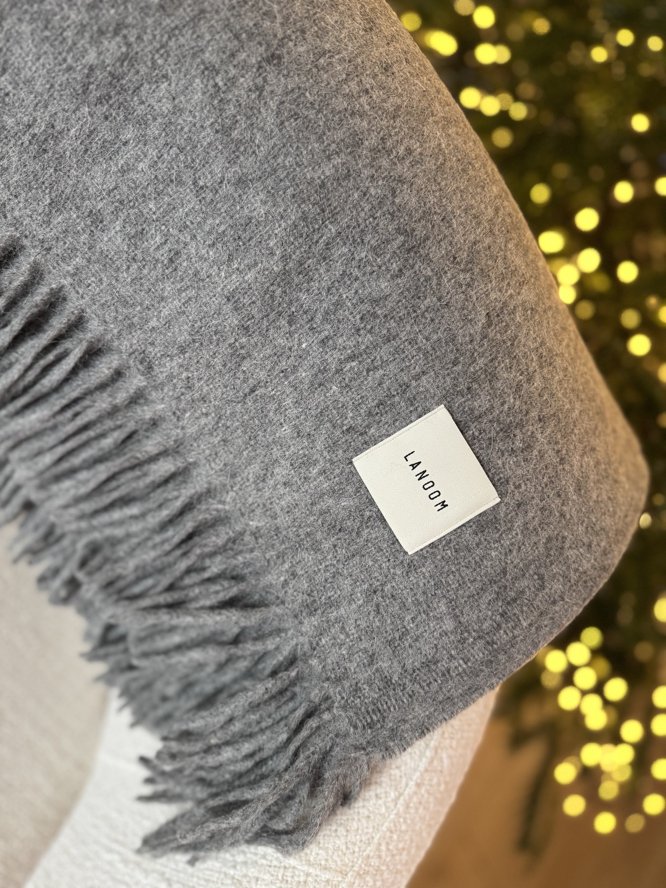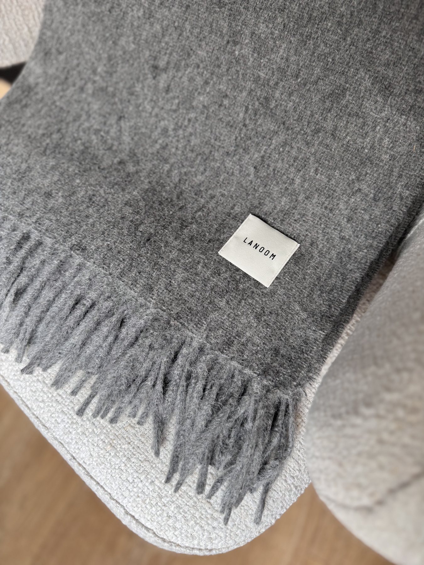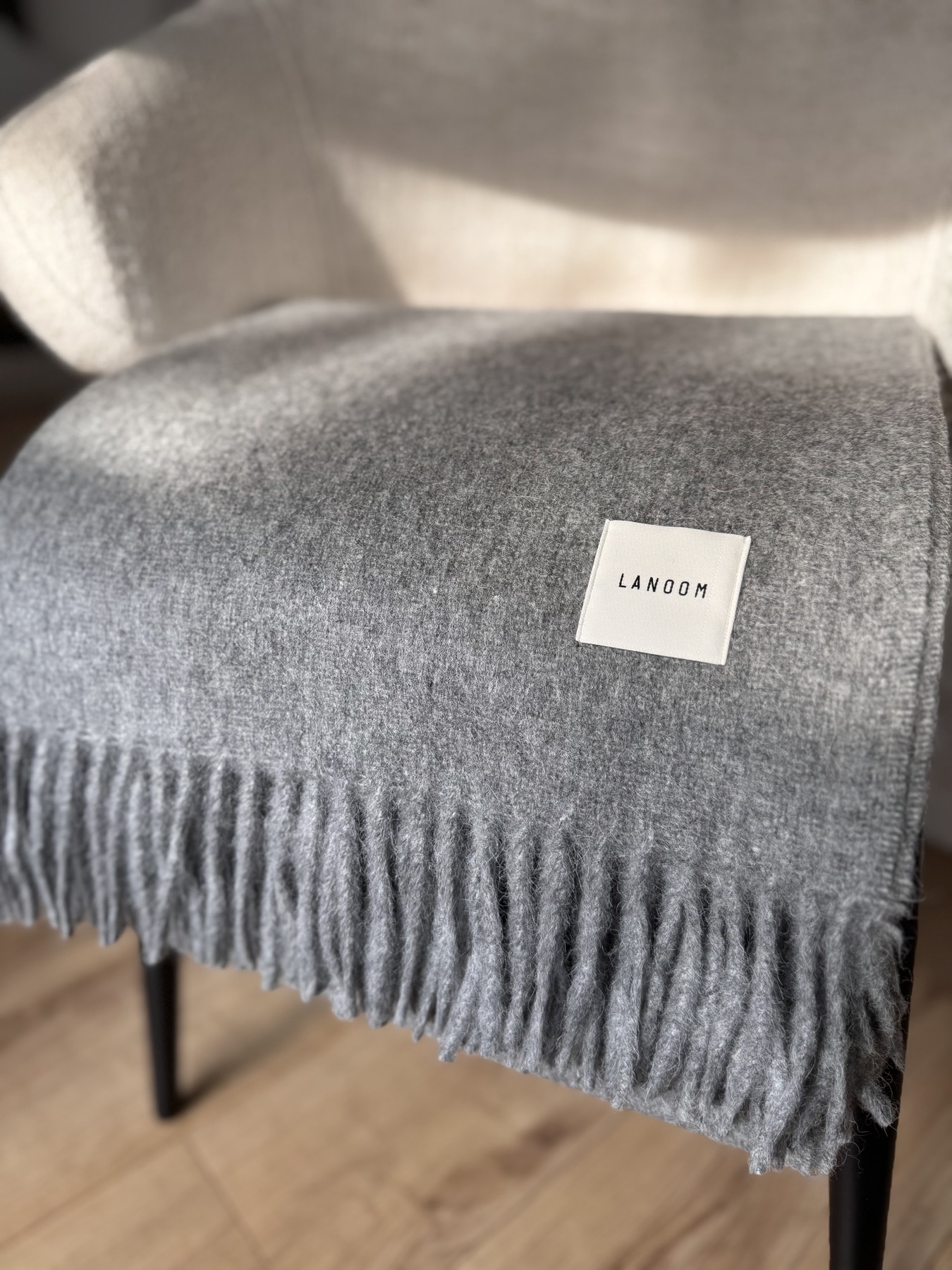 Całość dopełnia kwadratowa metka żakardowa z tkanym logo LANOOM — subtelny, designerski detal podkreślający luksusowy charakter koca.