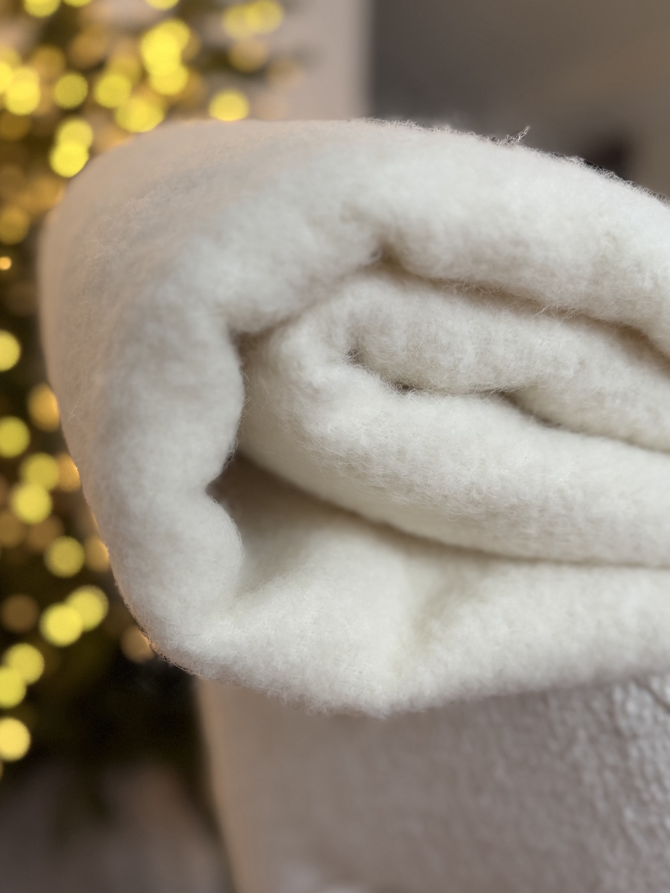 Wykonany z luksusowej wełny alpaki z niewielką domieszką nylonu (89% alpaka, 11% nylon), zachwyca niezwykłą miękkością i efektowną strukturą przypominającą zgrzebną, puszystą wełnę. To koc typu „chmurka” — wizualnie gruby i mięsisty, a jednocześnie wyjątkowo lekki. Waży zaledwie ~700 gramów, co sprawia, że otula komfortem, nie przytłaczając ciężarem.